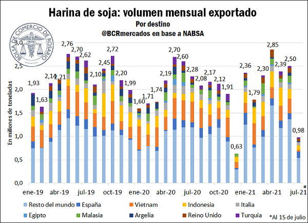 El primer semestre del año muestra embarques de harina de soja por cerca de 14.18 Mt. Este volumen representa un alza del 13% respecto al mismo período en el 2020, año que mostraba una baja del 6% respecto a los primeros seis meses del 2019. De esta manera, los primeros seis meses del 2021 ya superan el tonelaje embarcado en los mismos períodos tanto del 2019 así como del 2020.