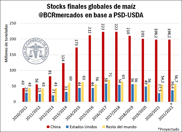 Por su parte, el pronunciado aumento de las importaciones chinas de maíz va dando cuenta de la mejora en su consumo interno, atribuido parcialmente a la recuperación de su stock de ganado porcino luego del fuerte brote de Peste Porcina Africana que asoló al gigante asiático. China se consolidó en la última década como actor global de peso en lo que hace a los stocks mundiales de maíz. Se espera en China una campaña 2021/22 con alzas en el consumo interno de maíz, que serán compensadas con incrementos en la oferta de la mano de más producción e importaciones, dejando sin cambios a los stocks del gigante asiático, que representan el 68% del almacenamiento mundial del grano amarillo y más de 240 días de consumo mundial de maíz.