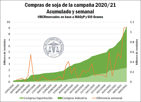 En los últimos 14 días se aceleraron con fuerza las compras de soja de la campaña 2020/21, superando ambas semanas el millón de toneladas vendido. Con vistas al sostenimiento de los márgenes positivos de procesamiento, el principal impulso para estas alzas en las compras viene de parte de la industria ya que este sector adquirió el 88% del poroto comercializado en las últimas cuatro semanas.