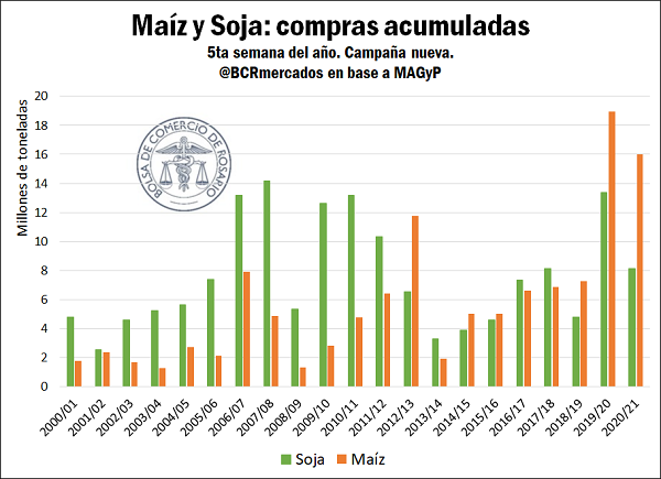 Para el maíz, se observan niveles mucho más elevados de compras, alentados en parte por el temor que nuevas intervenciones en el mercado afecten la fluidez de negocios. Con compras por casi 16 Mt, sólo se compara esta magnitud de compras con la campaña 2019/20, cuando se habían comercializado casi 19 Mt a esta altura.