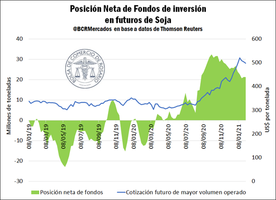 En octubre del año pasado el posicionamiento neto de los fondos de inversión en soja llegó a sus máximos niveles en 8 años. Desde entonces, se observa una sostenida tendencia de desarme de posiciones y tomas de ganancias, lo que parece mitigar las subas de precios que se vienen observando para la soja desde el año pasado.