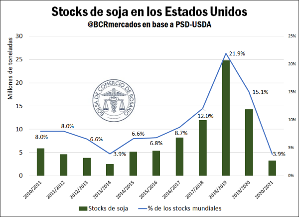 No obstante, el último informe del Oferta y Demanda Global del Departamento de Agricultura de los Estados Unidos (WASDE-USDA) proyectó una caída de stocks del 77% en los Estados Unidos, si comparamos la campaña 2020/21 con la 2019/20. La merca se explica por mayores exportaciones estimadas, producto del aprovechamiento norteamericano de la demora en la cosecha de soja brasilera.