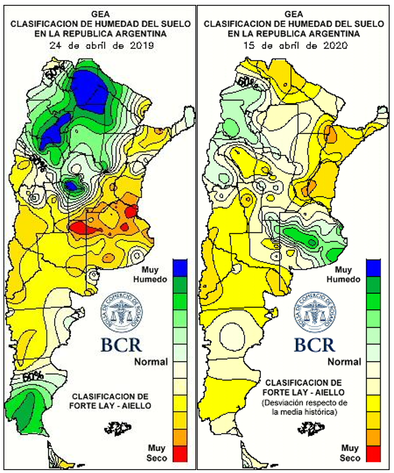 En términos de humedad de suelo, a fines de abril del 2019 Argentina quedaba dividida en dos. En el noroeste estaba el área más favorecida por las lluvias, en el sureste, la contracara era una severa falta. En el sureste Córdoba y el norte argentino mostraban muy buenas reservas y hasta excesos que contrastaban con la sequía del sur de Santa Fe y de Buenos Aires donde más se agravaba la situación. Lamentablemente, la falta de agua estuvo presente durante casi todo el 2019 en el territorio bonaerense. Y ahí es donde se observa la mayor diferencia con el 2020. Las lluvias de marzo y las reservas actuales son muy buenas en casi todo Buenos Aires. Con excepción del área suroeste, Buenos Aires aparece como la provincia más privilegiada de cara a la siembra de trigo 2020/21.