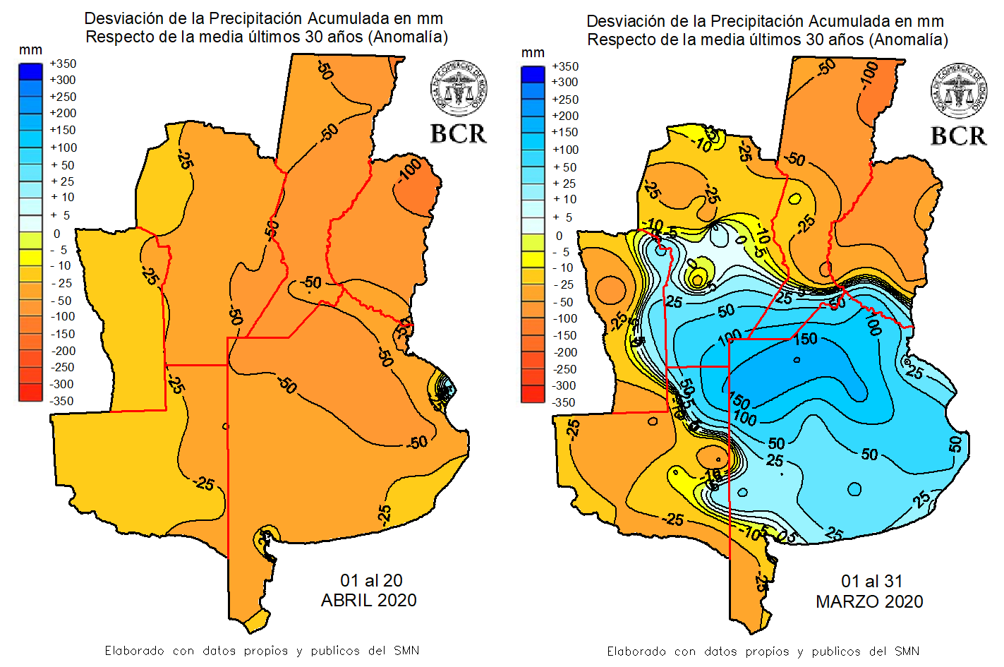 Desde el 9 de marzo, las lluvias volvieron y acumularon más de 100 mm sobre gran parte de la región pampeana hasta fin de ese mes. En el centro y el oeste los acumulados mensuales fueron de los 150 mm hasta los 300 mm. La media de marzo, siguiendo el gradiente de oeste a este, es 75 mm a 150 mm. El balance dejó una anomalía positiva de 50 a 150 mm por encima de la media como se muestra en la imagen. Con esos excesos había temor a no tener piso en los cuadros para avanzar con la cosecha gruesa.