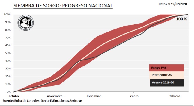 Durante los últimos quince días, las labores de siembra de sorgo granífero culminaron en toda el área agrícola nacional. Los mayores avances de siembra se relevaron en las provincias de Santa Fe y Salta. A la fecha ya se encuentra sembrado el 100 % de un área estimada para la campaña 2019/20 en 750.000 Ha., un 2,8 % superior al ciclo previo (Superficie campaña 2018/19: 730.000 Ha.). El avance interquincenal fue de 4 puntos porcentuales, en números absolutos unas 30.000 Ha. Finalmente, gran parte de los lotes más adelantados transitan etapas reproductivas bajo buenas condiciones.