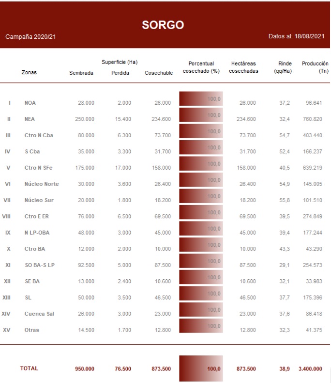 Con un avance interquincenal de 4,2 puntos, se dio por concluida la cosecha de sorgo granífero. Los lotes recolectados durante el final de la campaña se concentraron sobre el NEA y el sur de área agrícola, correspondientes a siembras tardías. El rinde medio nacional se ubicó en 38,9 qq/Ha, un incremento del 6,1 % con respecto al rendimiento promedio de la campaña 2019/20 (Rendimiento medio 2019/20: 36,7 qq/Ha), y se alcanzó una producción acumulada de 3,4 MTn.
