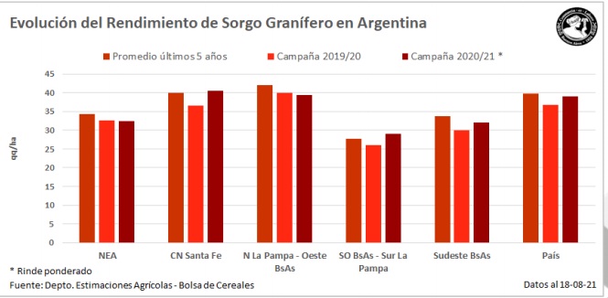 Pese a los daños por pulgón amarillo sobre el NEA y el Centro-Este de Entre Ríos y la heterogénea distribución de las precipitaciones en gran parte del área agrícola, los rendimientos se mantuvieron cercanos a las expectativas iniciales. Con un rinde medio de 53 qq/Ha, el Centro-Norte y Sur de Córdoba, junto a ambos núcleos, reportaron los mejores resultados.