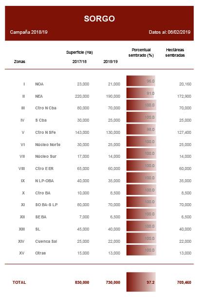 La disminución de los excesos hídricos en los lotes planificados para el cereal de verano promovió las labores de siembra en las provincias de Chaco, Santa Fe y en la región del NOA. A la fecha, la incorporación tanto de planteos tardíos como de segunda ocupación sobre rastrojos de girasol y fina elevaron el progreso de siembra al 97,2 %, restando por implantar cerca de 21.000 hectáreas de sorgo granífero.