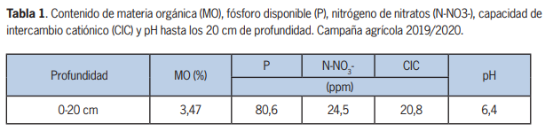 En la campaña 2019/20 se implantaron lotes de un ensayo, en el establecimiento “Don Antonio” de la familia Seib (Lat. 29°12’34.80”S; Long. 61°49’20.22”O) aproximadamente a 5 km al noroeste de la localidad de Tostado. El suelo corresponde a un Argiudol ácuico, serie Margarita, alcalino a menos de 50 cm de profundidad y se caracterizan por ser de textura franco limosa, con drenaje superficial deficiente con baja permeabilidad. El análisis de suelo realizado -previo a la siembra del cultivo- presentó un adecuado contenido de nitrógeno de nitratos, capacidad de intercambio catiónico y contenido de materia orgánica. EL valor de pH es levemente ácido y además, posee un alto contenido de fósforo (Tabla 1) La siembra se efectuó el 6 de noviembre de 2019, en diseño de macro parcelas (10 surcos de 200 metros de largo) con espaciamiento a 0,52 metros entre surcos, en un lote previamente laboreado. En post emergencia del cultivo se realizaron dos aplicaciones de fitosanitarios, una para control de malezas y otra para control de Spodoptera frugiperda. En la primera, se utilizaron 3 lt/ha de Atrazina al 50% + 0,5 l/ha de 2,4 D amina al 83% y en la segunda, se aplicaron 0,05 kg/ha de Benzoato de Emamectina 5% + Lufenurón 40% con 0,5 l/ha de aceite agrícola vegetal.