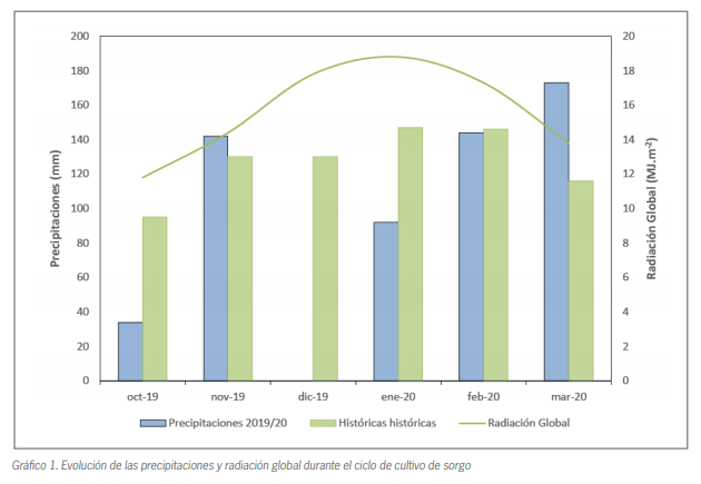 Un breve análisis comparativo climático durante los meses de crecimiento y desarrollo del cultivo de sorgo muestra que los registros pluviométricos de los meses de octubre, diciembre y enero estuvieron por debajo de los valores históricos para la zona (gráfico 1).