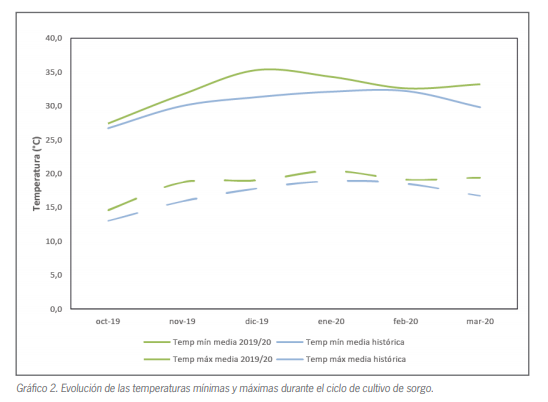 Las temperaturas mínimas y máximas en la campaña agrícola 2019/20 fueron superiores a los registros históricos, a excepción del mes de febrero, que tuvo valores similares (gráfico 2).