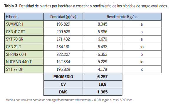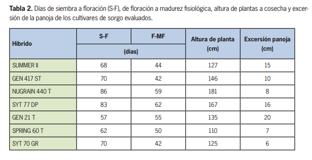 En la Tabla 2, se presentan datos fenológicos y morfológicos de los híbridos evaluados. El cultivar Nugrain 440 T presentó la mayor longitud a floración, siendo de 86 días desde la siembra, manifestando a su vez, mayor altura de planta a cosecha (181 cm). En cambio, el Gen 21 T fue el genotipo con menor número de días a floración (57 días) y con la mayor excersión de la panoja (20 cm). El genotipo SUMMER II tuvo el rendimiento más alto del ensayo (8.045 kg/ha) sin presentar diferencias significativas con GEN 417 ST y SYT 70 GR (Tabla 3). El híbrido SYT 77 DP fue el de menor rendimiento (4.178 kg/ha).