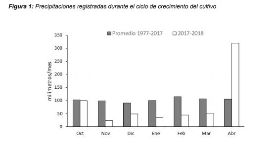 Las precipitaciones registradas durante el ciclo del cultivo definido entre los meses de noviembre y abril (517 mm) fueron levemente inferiores al promedio histórico registrado en el partido durante el período 1971-2017 (618 mm). Sin embargo, tanto la emergencia, como casi todo el ciclo del cultivo se desarrolló bajo un marcado estrés de precipitaciones, ya que entre noviembre y marzo sólo se registraron sólo 203 mm, cuando el promedio histórico para esos meses es de 510 mm (apenas un 39%, Figura1). El régimen de precipitaciones se recompuso recién en el mes de abril, triplicando el valor histórico para el mes (320 mm vs. 105 mm).