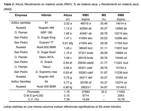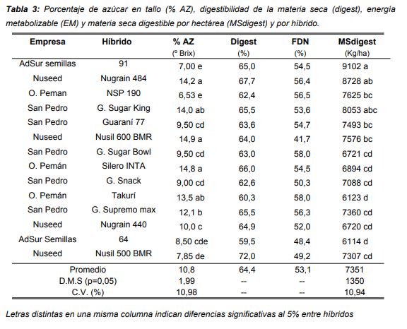 Se observaron diferencias significativas (p<0,0001) en el porcentaje de azúcar en tallo. El valor promedio fue de 10,8 ºBrix, con un máximo de 14,9 (Nuseed Nusil 600 BMR) y un mínimo de 7,00 (AdSur 91). La Digest promedio del ensayo fue de 64,4 %, con un máximo de 72,0% (Nuseed Nusil 500 BMR), y un mínimo de 59,5 (AdSur 64). La FDN promedio fue de 53,1%, con un máximo de 58% (Oscar Peman Takuri y Genesis Green Sugar Bowl), y un mínimo de 41,7% (Nuseed Nusil 600 BMR). Por último, se calculó la materia seca digestible (MSdigest) por héctárea como el producto entre el rendimiento en MS y la digestibilidad. También se observaron diferencias significativas (p=0,0033) entre híbridos para esta variable. La MSdigest promedio fue de 7351 Kg/ha, con valores máximos de 9102 kg/ha (AdSur 91) y mínimos de 6114 kg/ha (AdSur 64).