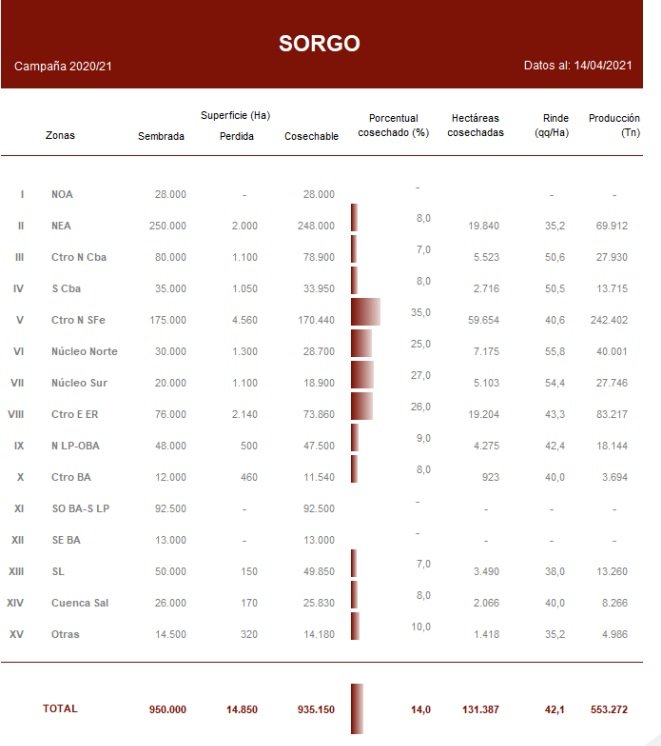 Durante los últimos quince días la cosecha de lotes de sorgo granífero se concentró en el centro y norte del área agrícola nacional. A pesar de los avances, aún se registran demoras en las labores producto de la falta de piso en parte de los lotes. Por otro lado, los productores están priorizando la cosecha de soja y maíz, posponiendo la recolección de sorgo. El avance de cosecha a nivel nacional ya se ubica en el 14 % del área apta, luego de relevar un progreso interquincenal de 4,4 puntos porcentuales. Frente a este panorama, mantenemos la actual proyección de producción para el presente ciclo de 3.000.000 Tn.