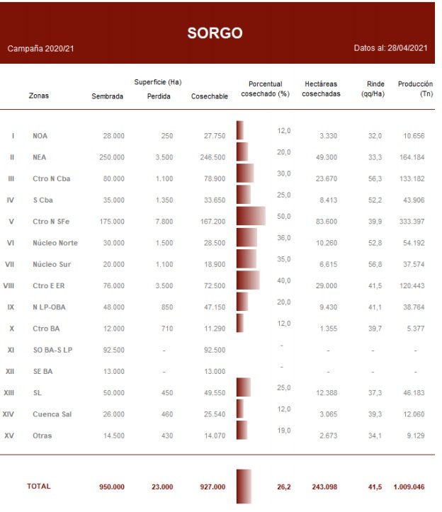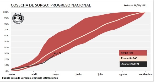 A medida que las labores comienzan a tomar impulso en el norte del país, se registran los efectos del ataque de pulgones de la caña de azúcar que sufrieron gran parte de los cuadros del cereal esta campaña. Los primeros rendimientos relevados, muestran una baja en las productividades en comparación a los rindes de las campañas previas. A pesar de esto, el aumento en la superficie destinada al sorgo y los excelentes rindes registrados en el oeste del área agrícola nacional, permiten sostener el volumen proyectado a nivel nacional.