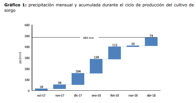 Entre octubre de 2017 y mayo de 2018, se realizó el seguimiento y apoyo técnico de una experiencia de incorporación de silajes de sorgo en el establecimiento ganadero del Sr. Ricardo Contreras, ubicado sobre el camino que une las localidades de San Pedro de Toyos y Deán Funes en el departamento Ischilín al noroeste de la provincia de Córdoba. En un lote de 34 ha de dicho establecimiento, se sembró un sorgo doble propósito (VDH 422) con destino a silaje de planta entera teniendo como cultivo antecesor, un maíz para cosecha cuyo rendimiento promedio fue de 62 qq/ha. Si bien, el destino original de este lote era la siembra de soja, la escasez de forraje que se avizoraba para afrontar el invierno 2018 debido a las condiciones climáticas imperantes durante la primavera – verano de 2017 obligaron a replantear la planificación del sistema en busca de mayor seguridad. En el gráfico 1 se presentan las precipitaciones ocurridas durante dicha campaña.