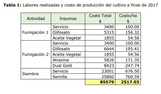 La siembra se realizó el 14/12/2017 a una densidad de 8 semillas/m lineal aproximadamente y un distanciamiento entre surcos de 52 cm. El cultivo no fue fertilizado y se hicieron dos aplicaciones de agroquímicos para el control de malezas previo a la siembra. Las labores realizadas y el costo de producción del cultivo de sorgo, se presentan en la tabla 1. 3 Durante el seguimiento del cultivo a lo largo de su ciclo, el sorgo presentó un adecuado desarrollo y estado general de las plantas y un nulo nivel de enmalezamiento (fotos 1-3) poniendo de manifiesto, la importancia de realizar un adecuado control previo a la siembra. Recordemos que la única forma de diluir los costos de producción del cultivo es maximizando su rendimiento.