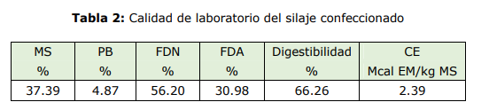 Utilizando esta información y sabiendo que el momento óptimo de picado se alcanza cuando el porcentaje de materia seca de la planta entera es del 35%, con un rango que oscila entre el 33 y 38% (ventana de picado), se estableció el día 30 de abril como fecha aproximada de picado el cual, efectivamente se realizó el 10 de mayo. Para esa fecha, el porcentaje de materia seca estimado por la metodología propuesta fue de 37,43% (0,25% diario * 30 días + 29,93% inicial). El porcentaje de materia seca de planta entera efectivamente alcanzado al momento de picado y la calidad del silaje de sorgo confeccionado, se puede observar en la tabla 2.