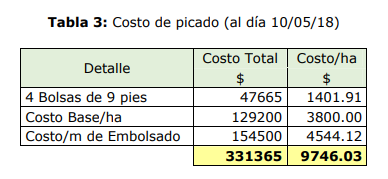 MS (%): porcentaje de materia seca, PB (%): porcentaje de proteína bruta, FDN y FDA (%): porcentaje de fibra en detergente neutro y ácido respectivamente y CE: concentración energética. El costo de picado, que se presenta en la tabla 3, incluyó la compra de 4 bolsas, el costo de base/ha y el costo por metro de bolsa confeccionado. En consecuencia, el costo total ($/ha) resultante de la suma del costo de producción del cultivo y el costo de picado, fue de $ 12263,06.