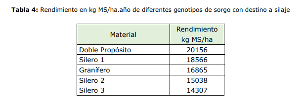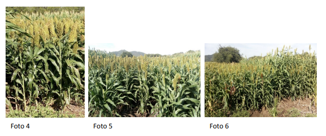 Durante esa misma campaña, en el establecimiento ganadero La Posta ubicado sobre la ruta 60 muy próximo a la localidad de Deán Funes, se evaluaron 5 híbridos de sorgo (1 granífero, 1 doble propósito y 3 sileros) destinados a la confección de silajes de planta entera. Los resultados de la tabla 4, muestran que los materiales evaluados presentaron rendimientos muy promisorios en relación a su contribución a la oferta forrajera total en los sistemas ganaderos de la región bajo estudio (fotos 4-6).