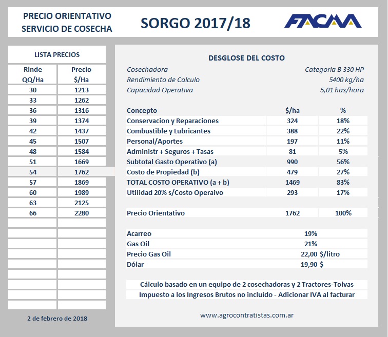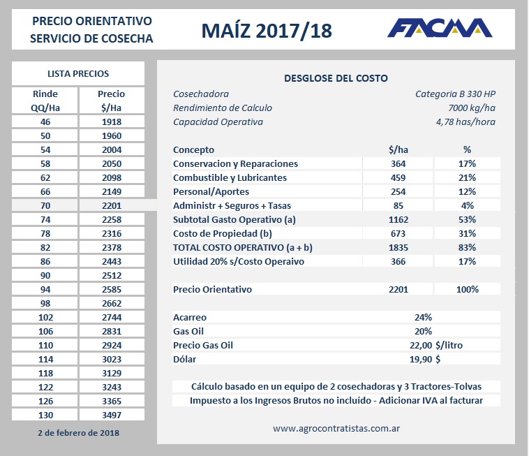 La estructura del precio elaborado por Facma contempla un equipo integrado por dos cosechadoras, tres tractores y tolvas, un valor del gasoil de 22 pesos por litro, un tipo de cambio de 19,90 pesos por dólar y una utilidad del 20 por ciento sobre el costo operativo.