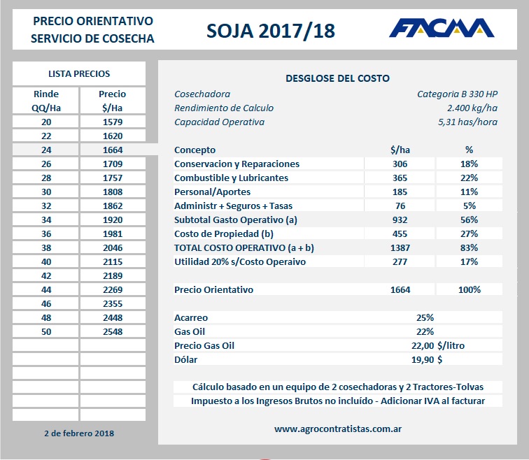 Para la recolección de 24 quintales por hectárea, el valor sugerido por Facma para el servicio en la actual campaña es de 1.664 pesos por hectárea (sin IVA). El precio es 28,5 por ciento más que en la campaña anterior, cuando el precio de referencia era de 1.295,3 pesos por hectárea.