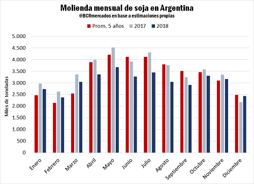 La industria aceitera cerró el año 2018 con un crushing acumulado de 36,7 millones de toneladas de soja. El volumen de oleaginosa industrializada es un 12 % inferior al de 2017 y un 8 % menor al promedio de la industria en los últimos cinco años. Durante los primeros tres meses del año 2018, el desempeño de la industria superó los niveles de crushing promedio de los últimos cinco años, aunque se mantuvo por debajo de los totales mensuales alcanzados en 2017.