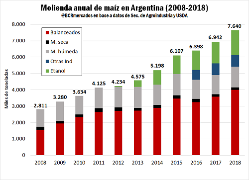 La molienda de maíz, por su parte, alcanzó los 6,14 millones de toneladas en el año 2018 según datos de la Secretaría de Agroindustria. Si también se tiene en cuenta lo procesado por la industria del etanol, la molienda de maíz en el año supera los 7,6 Mt, evidenciando un incremento interanual del 10 %. La mejor performance estuvo impulsada por aumento del 12 % de la industria de balanceados, que si bien no fue el mayor en términos porcentuales, sí conlleva el máximo aumento de volumen (casi 427.000 t más). La molienda húmeda sumó en 2018 más de 98.000 t que equivalen a un incremento interanual del 8 %, mientras que la molienda seca cayó en un 6 % restando más de 9.000 t. La industria del etanol, segunda en términos de tonelaje del cereal absorbido, se incrementó en un 14 % sumando más de 190.000 t al consumo de maíz. Como se observa en el gráfico, la molienda del cereal continúa creciendo, alcanzando un nuevo récord en el año 2018.