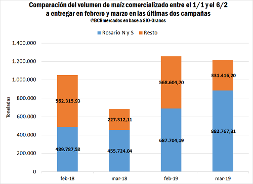 En lo que va de este 2019, el volumen comercializado de maíz, para entrega en febrero y marzo, supera ampliamente el nivel de negociaciones sobre las mismas posiciones en el inicio del año 2018. En las primeras 5 semanas de 2019 se lleva comercializado un 19 % más de maíz con entrega en febrero y un 78 % más de cereal con entrega en marzo, que equivale a 204.205 t más en febrero y 531.147 t más en marzo. El incremento más notable se da en las operaciones sobre maíz con entrega en las zonas de Rosario Norte y Rosario Sur (según regionalización de SIO-Granos), que, a su vez, concentran la mayor parte del volumen negociado en Argentina. Las negociaciones por maíz febrero para estas zonas crecieron un 40 % y por maíz marzo un 94 %. En el resto del país también aumentó, aunque en proporciones menores, en un 1 % y 46 %, respectivamente. De esta manera, el cereal comercializado para entrega en los próximos 60 días había superado las 2,4 millones de toneladas al 6 de febrero.