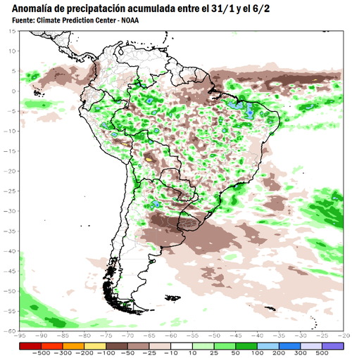 Se espera que los patrones climáticos divididos que han traído humedad a la Pampa norte y sequedad al resto de Argentina en gran parte de enero continúen durante la primera parte de febrero. También son constantes sus efectos mixtos en el desarrollo del maíz sembrado anteriormente y sobre la soja de primera, que en su mayor parte se encuentran en etapas reproductivas tempranas. Los modelos de pronóstico del tiempo muestran a nivel general un patrón seco en la región pampeana durante la próxima semana. El estado general de la humedad del suelo y sus variaciones regionales serán importantes para monitorear.
