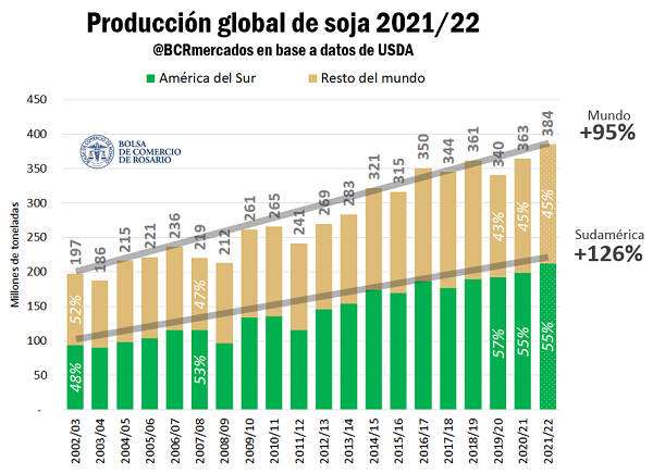 En las últimas 20 campañas la producción mundial de soja se ha incrementado en un 95%. El volumen cosechado pasó de 197 Mt en 2002/03 a un estimado de 384 Mt en 2021/22, casi duplicándose. Mas allá de este contundente incremento en la producción global, las cosechas de soja sudamericana mostraron un crecimiento aún más espectacular en el mismo período. La producción regional pasó de 93,9 Mt en 2002/03 a un estimado de 212,3 Mt en 2021/22, exhibiendo un crecimiento del 126% y más que duplicándose. En 2021/22 el cono sur superaría por primera vez la barrera productiva de 200 Mt. De acuerdo con datos del USDA, se espera que Brasil consolide una cosecha de 144 Mt, equivalente al total de la producción Sudamericana unos pocos años atrás, en la campaña 2012/13.