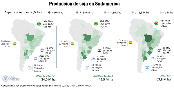 A inicios de siglo, la superficie destinada al cultivo de soja en la región acumulaba 34,0 M ha, un área equivalente a todo el territorio de Alemania. En el promedio de las campañas 2001/02-2003/04, Brasil sembró el 54% del área de Sudamérica, Argentina el 37% y Paraguay el 5%. Diez campañas más tarde, en el cono sur ya se cubrían cerca de 50 M ha con soja, y todos los países analizados sumaban superficie sembrada de la oleaginosa.