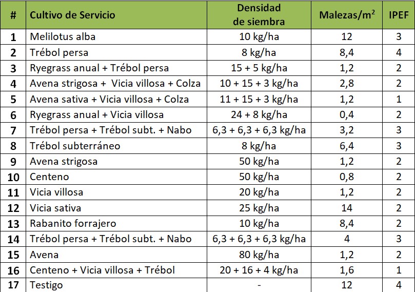 - Cabe destacar el tratamiento de Vicia villosa sola que aún sin poseer los rasgos de los CS mencionadas como favorecedoras del control de malezas, tuvo un desarrollo que permitió alcanzar niveles bajos de presencia de malezas, así como de IPEF de las mismas.