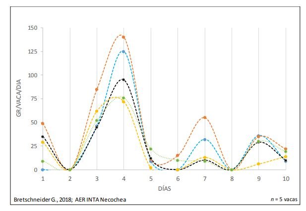 Figura1: Consumo de bloques para lamer (95 % sal). Variación entre y en (día a día) cada animal. Para cada día, cada punto representa el consumo individual y la comparación entre los mismos evidencia la variación de consumo entre las vacas. A través de los días, las líneas grafican la variación del consumo en cada animal.