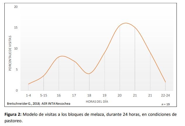 Al igual que para el suministro de minerales en comederos, el consumo de bloques ocurre a cada hora del día con mayor porcentaje de vistas al anochecer (Figura 2).