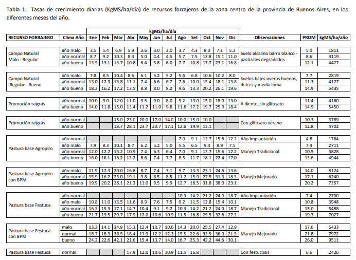 Las tablas para la presupuestación forrajera son el producto del trabajo de varios años y sitios de experimentación en distintos recursos forrajeros utilizados en los sistemas ganaderos del centro de la provincia de Buenos Aires. Tienen el valor de ser obtenidas de sistemas reales de producción y además, en años con distintas situaciones climáticas.