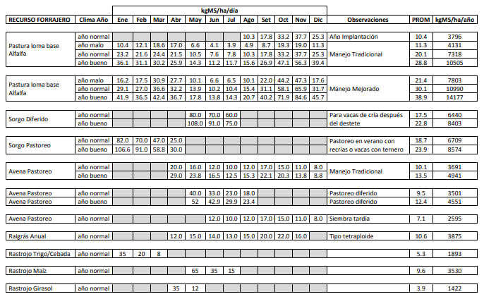 El balance nutricional se utiliza para ajustes diarios en calidad y cantidad de alimentos y en requerimientos de los animales. Requiere información específica de que es lo que están comiendo los animales y la relación con los resultados productivos que esperamos, por ejemplo cuanto espero que ganen los animales en pastoreo, o que requerimientos tienen las vacas en ordeñe para producir una determinada cantidad de litro por día. Se utiliza en sistemas muy intensificados como tambos o engordes a corral. Ejemplo: Para el lote de novillos en engorde de 350 kilos en etapa final de terminación, necesitamos que ganen 1 kg/cab.día durante 75 días. Se debe dar una dieta de 2,8 Mcal/kgMS y además debe tener 15% de contenido proteico. La limitante más importante para realizar las planificaciones y presupuestaciones forrajeras, es la dificultad para encontrar información de calidad y con continuidad sobre la producción de forrajes zonal o local. En ese sentido es que se presentan la siguiente tabla, producto del trabajo de varios años y sitios de experimentación en distintos recursos forrajeros utilizados en los sistemas ganaderos del centro de la provincia de Buenos Aires.
