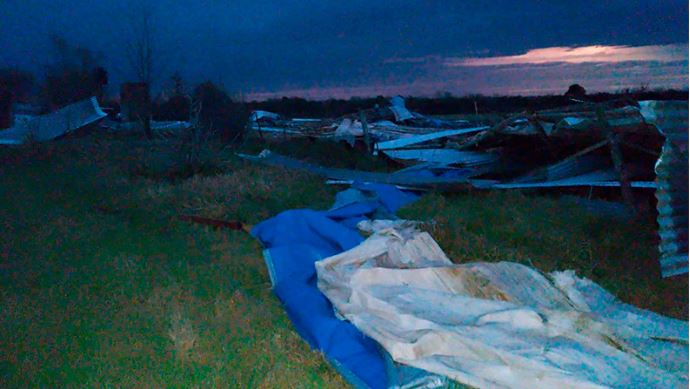 En la zona rural de Durazno (departamento Tala)en Entre Ríos, se registró la voladura del gallinero de un establecimiento avícola como consecuencia del viento y la granizada. “Se voló toda la granja”, reportó el productor.