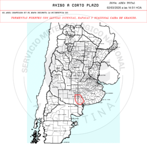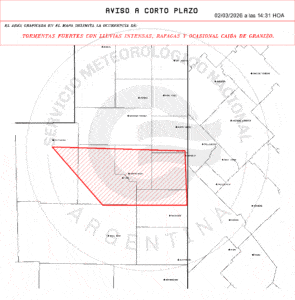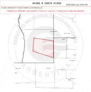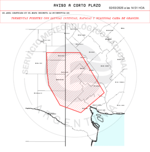 Cuatro avisos de corto plazo marcan tormentas fuertes con lluvias intensas, ráfagas y posible granizo sobre sectores rurales de Buenos Aires, La Pampa y San Luis. La ventana de impacto es inmediata, con validez de hasta 3 horas desde la emisión.