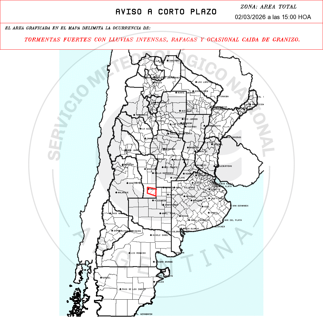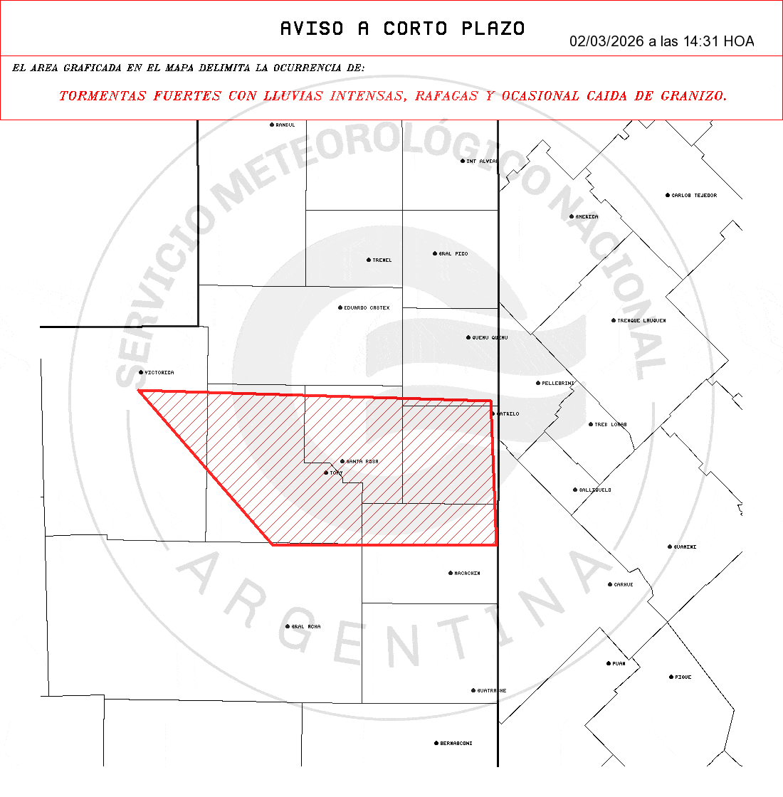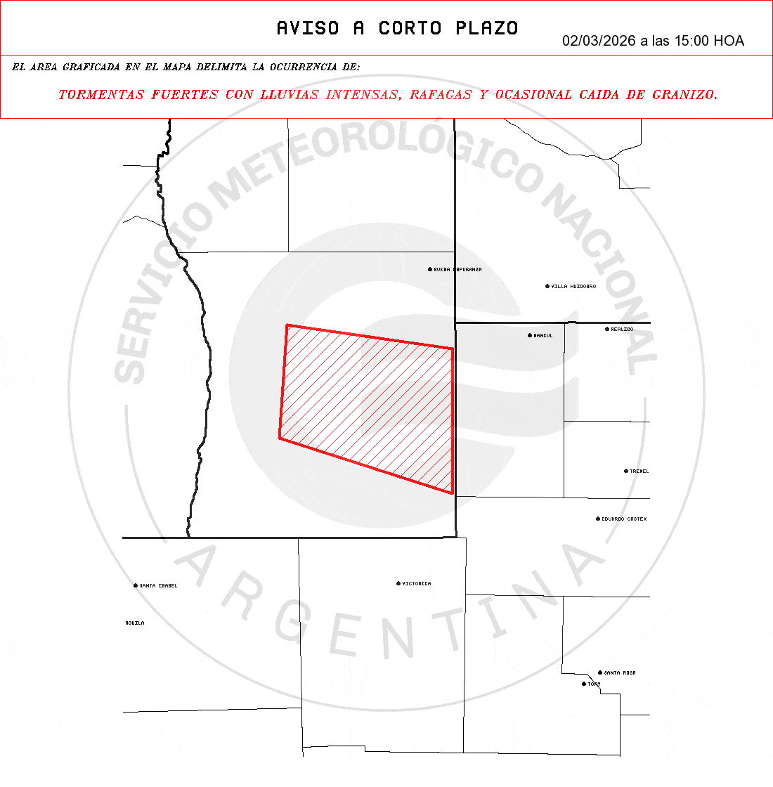 Cuatro avisos de corto plazo marcan tormentas fuertes con lluvias intensas, ráfagas y posible granizo sobre sectores rurales de Buenos Aires, La Pampa y San Luis. La ventana de impacto es inmediata, con validez de hasta 3 horas desde la emisión.