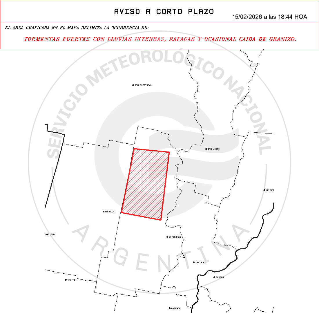 Se esperan lluvias abundantes en cortos períodos, viento intenso y caída aislada de granizo en las zonas bajo aviso.