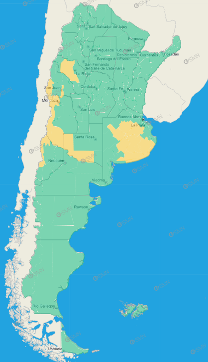 Buenos aires: Bolívar – Carlos Casares – Carlos Tejedor – Hipólito Yrigoyen – Pehuajó – Alberti – Bragado – Chivilcoy – General Viamonte – Nueve de Julio – Veinticinco de Mayo – General Alvear – General Belgrano – General Paz – Las Flores – Lobos – Monte – Navarro – Roque Pérez – Saladillo – Azul – Rauch – Tapalqué – Zona baja de Benito Juárez – Zona baja de Tandil – Zona serrana de Benito Juárez – Zona serrana de Lobería – Zona serrana de Necochea – Zona serrana de Tandil – General La Madrid – Laprida – Olavarría – Adolfo Gonzales Chaves – Centro de Lobería – Norte de Coronel Dorrego – Norte de Necochea – Norte de San Cayetano – Norte de Tres Arroyos – Costa de Lobería – Costa de Necochea – Costa de San Cayetano – Costa de Tres Arroyos – Costa de General Pueyrredón – Costa de Mar Chiquita – General Alvarado –  Ayacucho – Balcarce – General Guido – Maipú – Noroeste de General Juan Madariaga – Noroeste de Mar Chiquita – Oeste de General Pueyrredón –