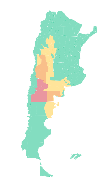 Buenos Aires: Norte de Bahía Blanca – Oeste de Patagones – Oeste de Villarino – Puan – Zona baja de Coronel Pringles – Zona baja de Coronel Suárez – Zona baja de Saavedra – Zona baja de Tornquist