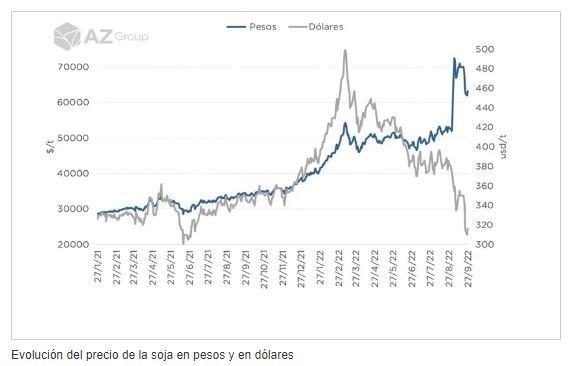 Para Sofía Ganly, analista de mercados de AZ Group, con el dólar soja “subió el precio de la tonelada de la oleaginosa en pesos, pero se desplomó en dólares”. Recordó que en los primeros 15 días de septiembre se vendió soja a más de $70.000 por tonelada, el valor al que el ministro de Economía, Sergio Massa, prometió que se les iba a pagar a los productores.