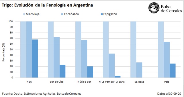La condición hídrica entre adecuada y óptima aumentó 17 puntos porcentuales luego de las lluvias. En cuanto a la fenología, el 63,9 % de la superficie transita desde encañazón en adelante.