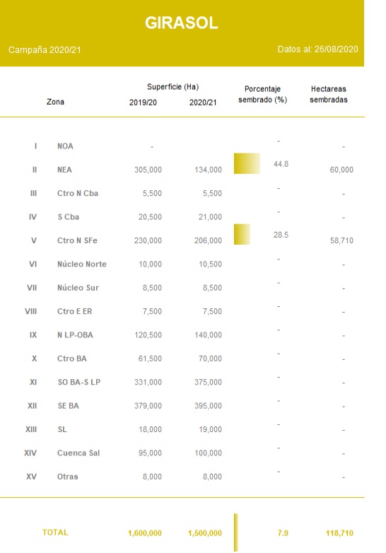 La siembra cubre el 7,9 % sobre una nueva proyección de área para el ciclo 2020/21 de 1,5 MHa, que se traduce en una reducción de área interanual de -6,5 %. La siembra presenta una demora interanual de -13,1 pp.