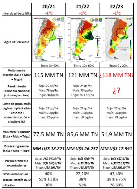 En el siguiente cuadro, a fin de compactar lo ocurrido desde el 2020 hasta la fecha, y lo que podría ocurrir los próximos meses, en materia climática, productivo y económica, se plasman algunos indicadores claves para las tres campañas, la 20/21, la 21/22 y la 22/23.