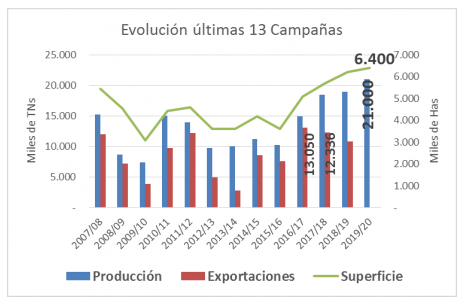 Pero veamos las exportaciones también, desde la 16/17 han superado las 12 millones de toneladas. Hasta la fecha por ejemplo, se llevan más de 10 millones de toneladas comercializadas al sector exportador, veremos si este volumen supera nuevamente las 12 millones de toneladas.