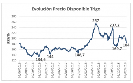 El martes pasado se publicó el boletín de la Pre campaña de trigo 19/20, de la Bolsa de Cereales de Buenos Aires. En el mismo se anticipa una superficie de siembra récord para los últimos 20 años, de 6,4 millones de hectáreas, y un potencial productivo de 21 millones de toneladas. No es de extrañar que luego de dicho informe, los precios futuros del trigo 19/20, diciembre 2019, enero y marzo 2020, hayan ido en picada, perdiendo en dos jornadas más de U$S -5/TN, pasando de un rango entre U$S 168 y 177/TN a uno entre U$S 162 y 172/TN.